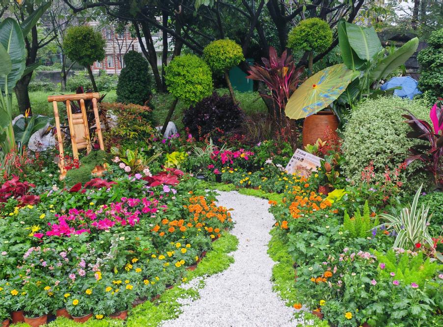 设计灵感来源于重庆独特的山地地貌。该作品通过精确的地形塑造与植物配置,再现了山城特有的空间形态。设计采用鹅卵石铺设蜿蜒路径,象征长江与嘉陵江的地理特征,同时融入陶罐、竹椅等具有地方特色的元素,构建出兼具生态价值与人文内涵的景观空间。在植物选择方面,团队特别考虑了不同季节的观赏效果,确保景观的持续吸引力。