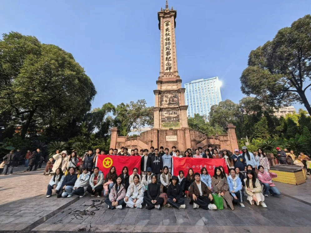 在辛亥秋保路死事纪念碑前,当了解到1911年四川人民为保铁路主权、反对外来压迫,哪怕面对镇压仍英勇抗争的史实后,不少成员驻足良久。大家看着碑上“万众一心”的精神象征,纷纷表示真切体会到“爱国从不是口号,而是先辈用热血践行的信仰”。这种发自内心的触动,让红色基因在青年心中悄然扎根,也让大家更懂如今的和平与发展来之不易。