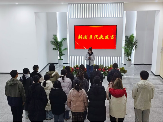在团委组织部部长禹畹秋的带领下,新团员面向团旗,高举右拳庄严宣誓。这既是对共青团组织的郑重承诺,也强化了团员的身份意识与责任担当,指引新团员牢记初心使命,以实际行动践行入团誓言,在民族复兴征程中奋勇争先。