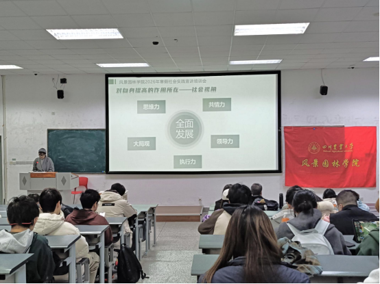为深入贯彻“时代新人铸魂工程”要求,响应“返家乡”社会实践专项计划部署,2025年12月16日,风景园林学院团委实践部特举办“青矜致远,实干兴邦”主题寒假社会实践培训会,助力“十五五”规划开局之年实践育人工作。学院各年级、各专业学生代表齐聚现场,共同解锁实践政策要点、夯实实操技能,为本次寒假社会实践筑牢根基。