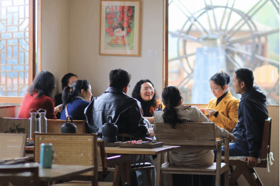 分享会后,教职工们在尹航的带领下,沉浸式体验了 “三农纪・田咖” 的景观设计与运营模式。从庭院景观的乡土肌理保留,到室内空间的在地文化融入,再到周边韭菜田景观与业态的联动打造,每一处细节都彰显着风景园林专业在乡村振兴中的价值。大家纷纷驻足观察、交流探讨,结合自身教学科研经验,就乡村景观更新、闲置空间活化、文旅业态融合等话题展开深入互动,为乡村风景园林建设提出了诸多专业见解。