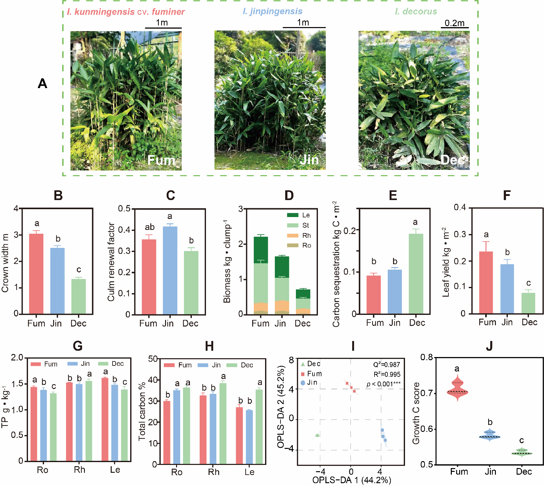 箬竹属植物具有重要的经济和生态价值,然而当前栽培实践忽视了其固有的生长策略差异,制约了可持续管理目标的实现。该研究选取三种不同生态型的箬竹,分别代表竞争型(粽叶箬竹,Fum)、平衡型(金平箬竹,Jin)和耐受型(美丽箬竹,Dec),系统比较了其生长性状、根际效应及微生物群落特征。