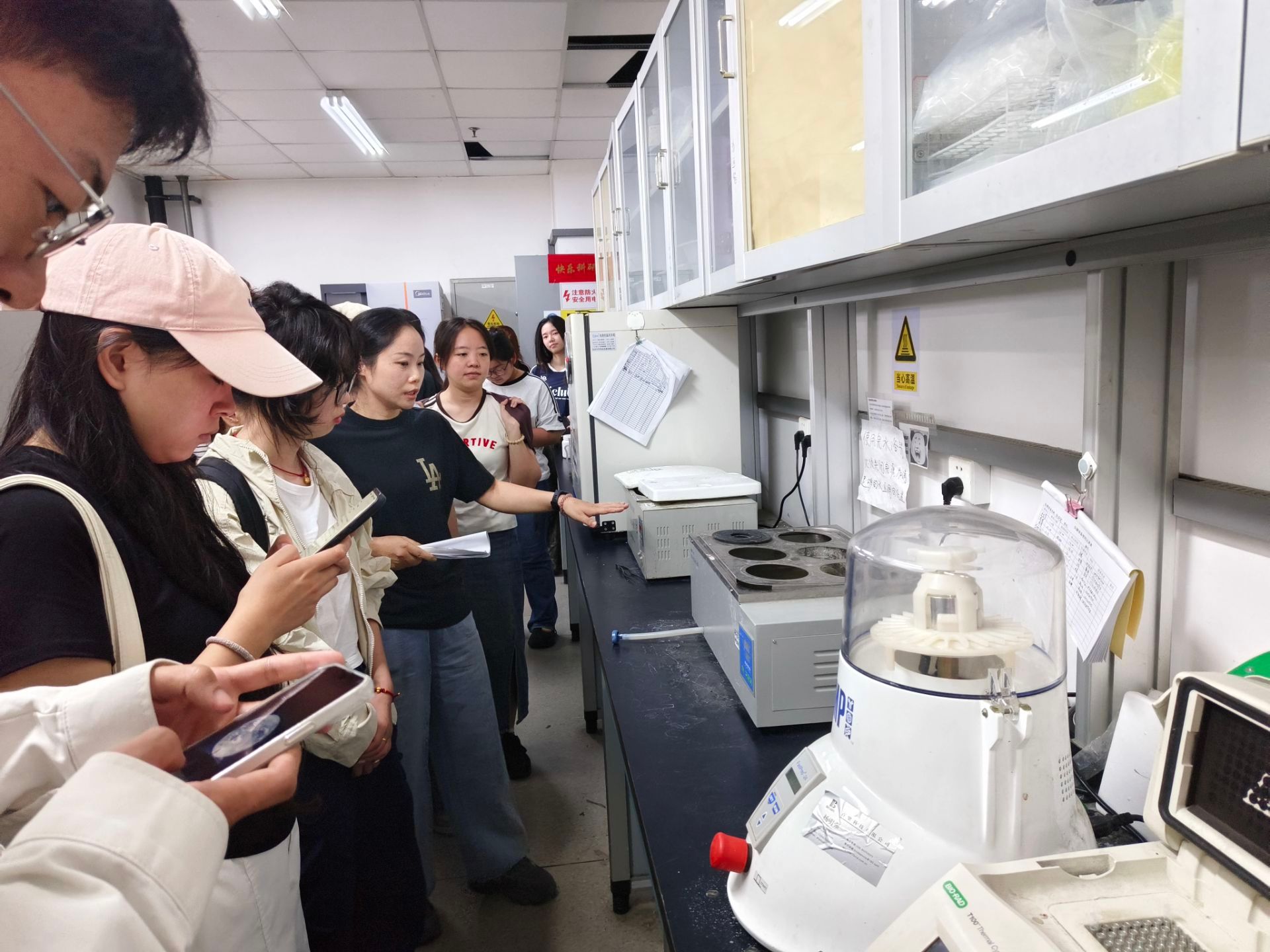 在实地教学环节,蔡仕珍、赵君芬两位管理员带领学生走进实验室,结合场地布局、仪器设备使用、实验操作流程等真实场景,逐项讲解安全注意事项与规范操作步骤,将理论知识与实践场景紧密结合,让安全要求入脑入心。