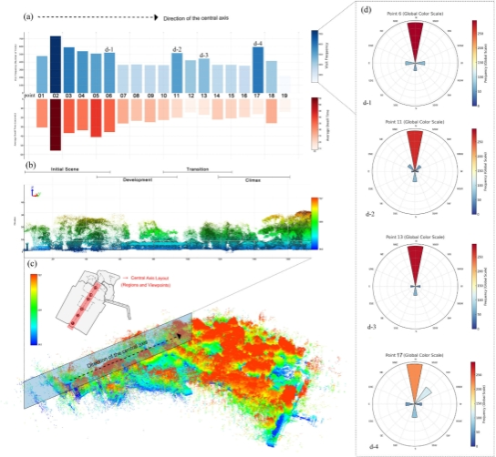 该研究综合运用了全景影像采集、语义分割、机器学习等数智化技术,并依托自主研发的全景漫游平台,对自然性、纪念性、复杂性、视觉尺度和色彩五大维度进行精准测度,实现了游客行为数据与空间特征的点位匹配。结果揭示了水体与纪念性元素在提升游客停留和流动中的关键作用,并指出中轴线纪念性景观在引导游客行为方面具有显著效应。论文提出的“视觉特征—位移行为”一体化分析框架,为古典园林感知设计、遗产保护和游憩管理提供了新路径。