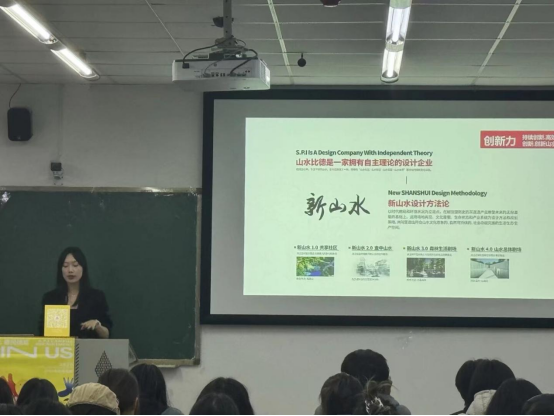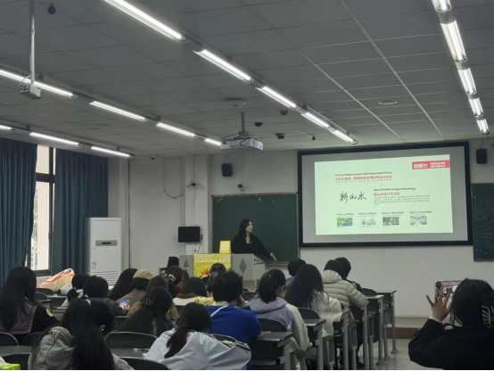 在分享环节中,山水比德设计总监以“山水为核,设计为用”为主题,结合多个亲身主导的实际项目,系统阐述了设计理念从概念构思到落地实施的全流程。他详细介绍了项目背景、面临的挑战、创新性解决方案以及最终成果,并强调“设计不仅是图纸上的表达,更是对场地、文化、人群需求的深度回应”。通过真实案例的复盘,同学们得以近距离感受设计实践中的思考逻辑与执行策略。