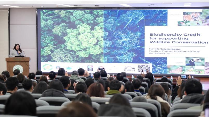 主旨报告环节,中泰学者围绕绿色发展关键领域分享最新研究成果。四川省林业科学研究院刘雄博士以系统阐释竹资源多维价值与关键培育技术,为“以竹代塑”提供实践路径。泰国农业大学南蒂达・素塔玛翁博士(Dr. Nantida Sutummawong)分享犀鸟重引入案例实证的生物多样性信用工具市场化经验,基塔纳帕特・巴拉梅瑟姆松先生(Mr. Kittanapat Baramesermsong)围绕循环经济与环境治理,提出“减量化-再利用-资源化”法律优化方案。我校潘翔副教授以《大熊猫国家公园全民共享与自然教育路径探索》为题创新提出“IP+手绘+在地场景”自然教育模式,吕兵洋副教授汇报了竹林生态康养价值量化研究的新进展。