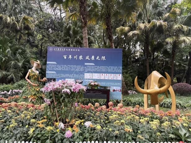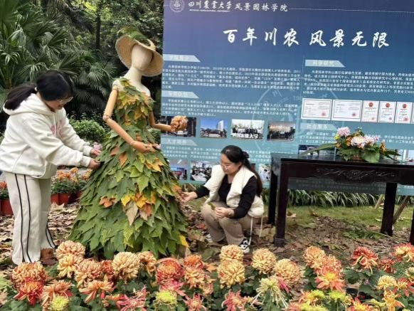 11月20日,由成都市公园建设管理局指导、成都市人民公园主办的2025年成都人民公园赏菊活动圆满落幕。本次菊展中,风景园林学院国家一级花艺师杜娟副教授带领13名研究生,以专业实践为抓手,全程深度参与展区的统筹策划、方案设计与现场搭建,打造出兼具学术特色与艺术美感的专属展区(图1、2),不仅集中呈现了学院在人才培养、科学研究等领域的成果,更成为锤炼学生实践能力的“实战课堂”。