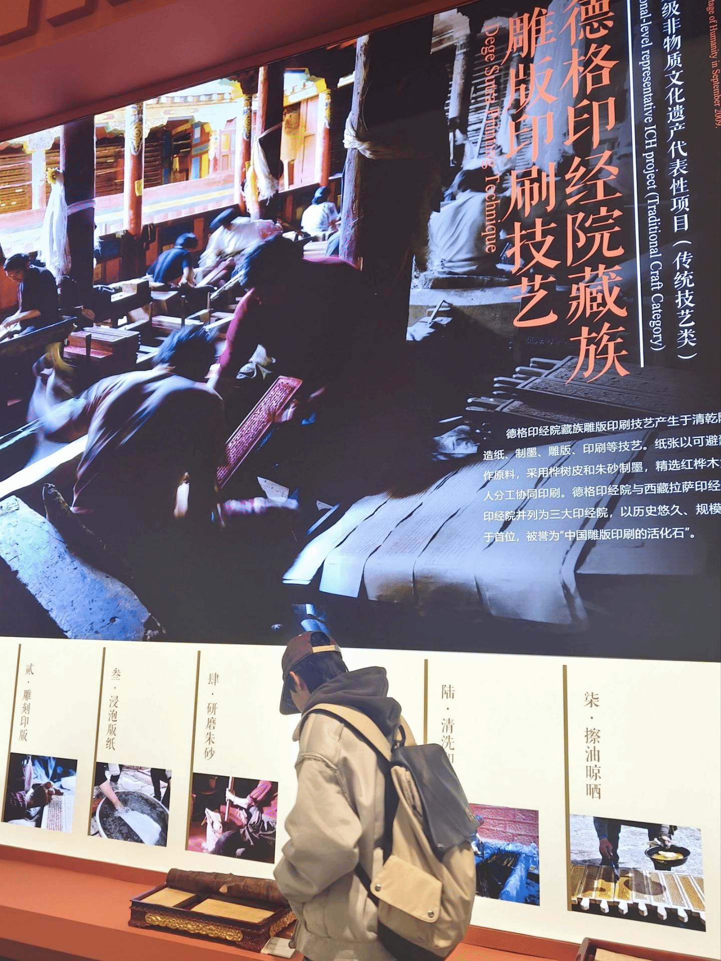沿展线前行,成都漆艺、藏族唐卡、德格印经院藏族雕版印刷技艺、成都银花丝等非遗传承名作依次铺展。在成都漆艺展区,团队成员们观察到历经“三雕一刻、百灰百漆”工序的漆器作品,温润的漆色与细腻的纹理,启发大家思考传统色彩与天然材质在现代景观设施中的应用可能;成都银花丝展区里,花丝镶嵌的精致纹样,为园林装饰细节设计提供了新的灵感;而德格印经院藏族雕版印刷技艺展区,古老的雕版与完整的印刷流程,让大家深刻理解了文化传承的“工匠精神”。