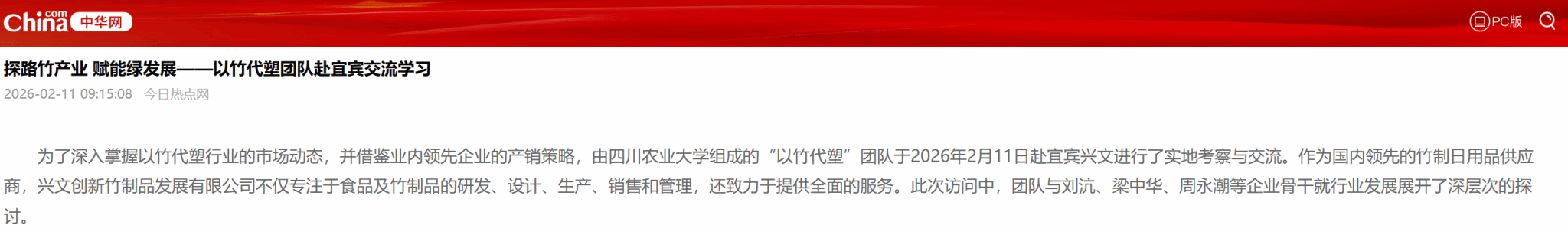 为了深入掌握以竹代塑行业的市场动态,并借鉴业内领先企业的产销策略,由四川农业大学组成的“以竹代塑”团队于2026年2月11日赴宜宾兴文进行了实地考察与交流。作为国内领先的竹制日用品供应商,兴文创新竹制品发展有限公司不仅专注于食品及竹制品的研发、设计、生产、销售和管理,还致力于提供全面的服务。此次访问中,团队与刘沆、梁中华、周永潮等企业骨干就行业发展展开了深层次的探讨。