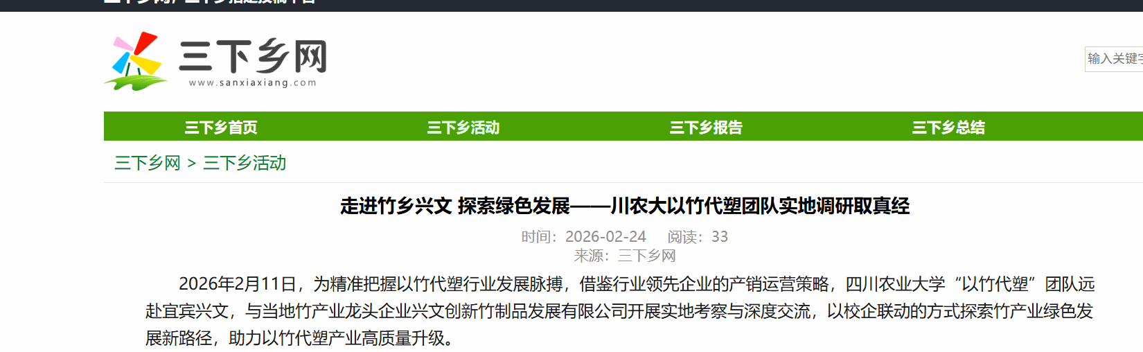 2026年2月11日,为精准把握以竹代塑行业发展脉搏,借鉴行业领先企业的产销运营策略,四川农业大学“以竹代塑”团队远赴宜宾兴文,与当地竹产业龙头企业兴文创新竹制品发展有限公司开展实地考察与深度交流,以校企联动的方式探索竹产业绿色发展新路径,助力以竹代塑产业高质量升级。